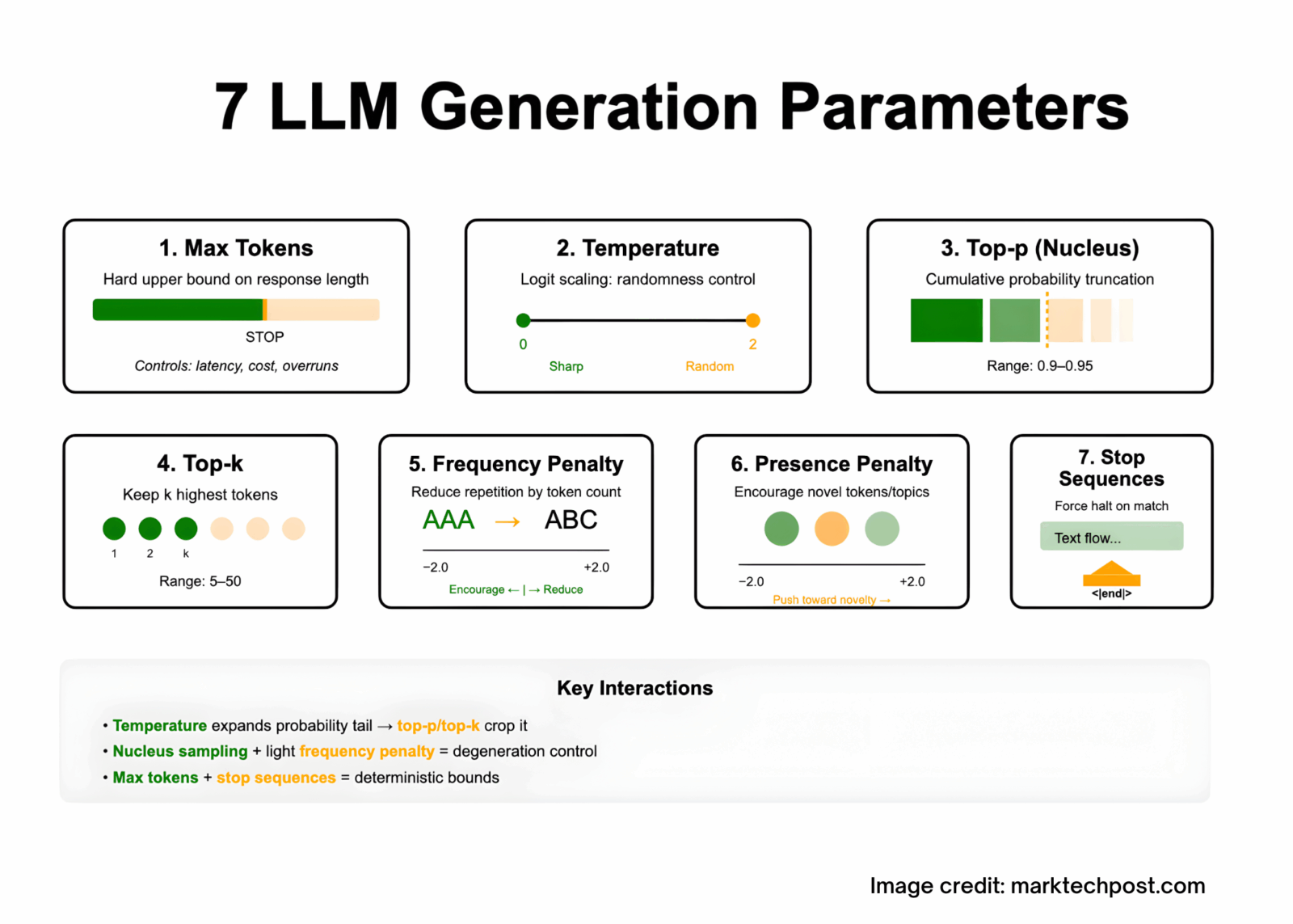 Tuning LLM outputs is largely a decoding problem: you shape the model’s next-token distribution with a handful of sampling controls—max tokens (caps response length under the model’s context limit), temperature (logit scaling for more/less randomness), top-p/nucleus and top-k (truncate the candidate set by probability mass or rank), frequency and presence penalties (discourage repetition or encourage novelty), and stop sequences (hard termination on delimiters). These seven parameters interact: temperature widens the tail that top-p/top-k then crop; penalties mitigate degeneration during long generations; stop plus max tokens provides deterministic bounds. The sections below define each parameter precisely and summarize vendor-documented ranges and behaviors grounded in the decoding literature.