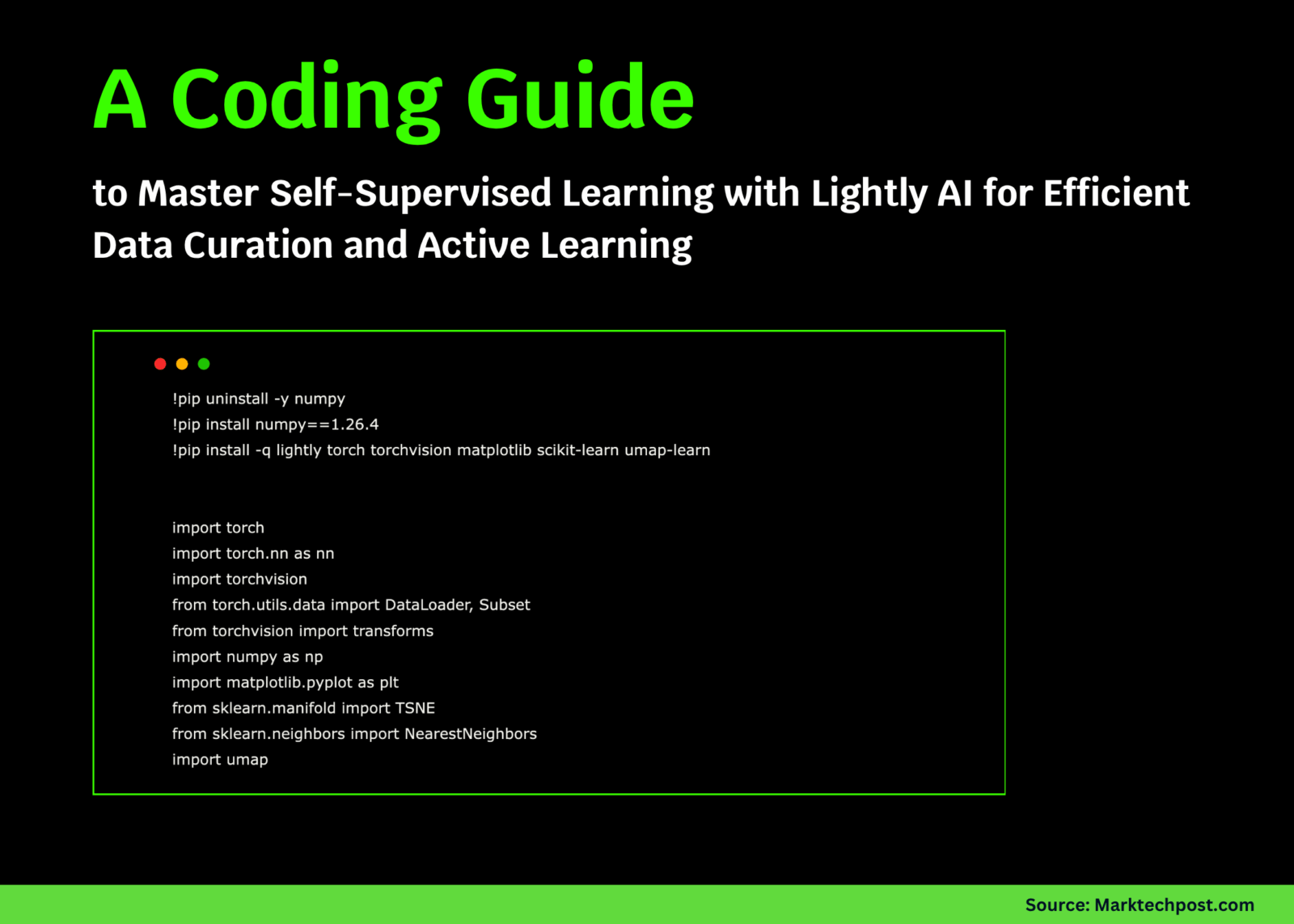 In this tutorial, we explore the power of self-supervised learning using the Lightly AI framework. We begin by building a SimCLR model to learn meaningful image representations without labels, then generate and visualize embeddings using UMAP and t-SNE. We then dive into coreset selection techniques to curate data intelligently, simulate an active learning workflow, and finally assess the benefits of transfer learning through a linear probe evaluation. Throughout this hands-on guide, we work step by step in Google Colab, training, visualizing, and comparing coreset-based and random sampling to understand how self-supervised learning can significantly improve data efficiency and model performance. Check out the FULL CODES here.
