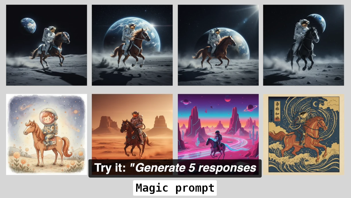Istället för att be AI:n ge ett svar, ber du den generera flera olika svar tillsammans med sannolikheterna för varje alternativ. Detta tvingar modellen att tänka bredare och utforska fler kreativa vägar samtidigt.