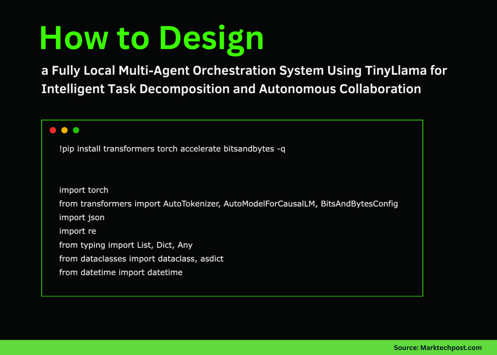 In this tutorial, we explore how we can orchestrate a team of specialized AI agents locally using an efficient manager-agent architecture powered by TinyLlama. We walk through how we build structured task decomposition, inter-agent collaboration, and autonomous reasoning loops without relying on any external APIs. By running everything directly through the transformers library, we create a fully offline, lightweight, and transparent multi-agent system that we can customize, inspect, and extend. Through the snippets, we observe how each component, from task structures to agent prompts to result synthesis, comes together to form a coherent human-AI workflow that we control end-to-end. Check out the FULL CODES here.