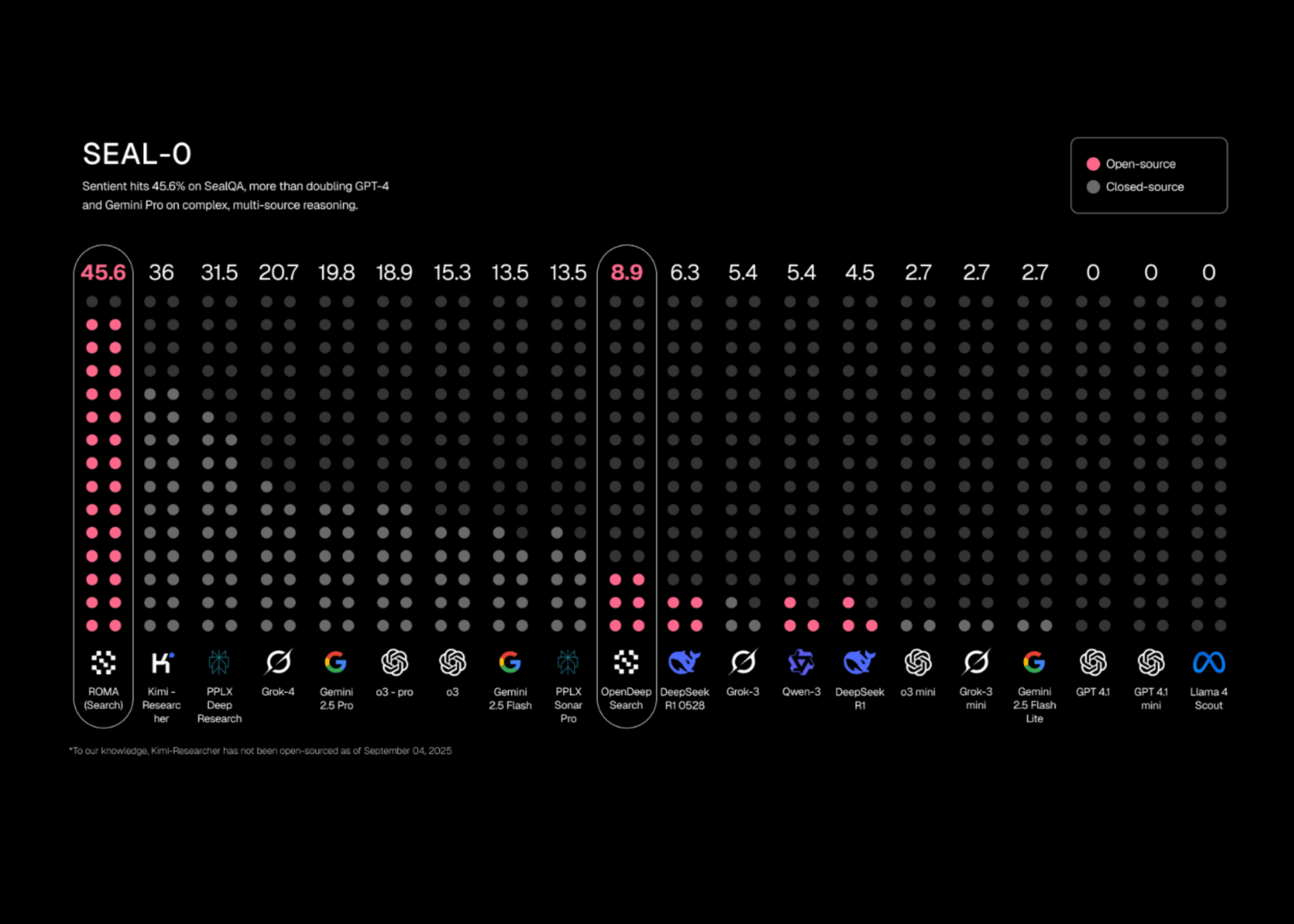 To validate the architecture, Sentient built ROMA Search, an internet search agent implemented on the ROMA scaffold (no domain-specific “deep research” heuristics claimed). On SEALQA (Seal-0)—a subset designed to stress multi-source reasoning—ROMA Search is reported at 45.6% accuracy, exceeding Kimi Researcher (36%) and Gemini 2.5 Pro (19.8%). The ROMA also reports state-of-the-art on FRAMES (multi-step reasoning) and near-SOTA on SimpleQA (factual retrieval). As with all vendor-published results, treat these as directional until independently reproduced, but they show the architecture is competitive across reasoning-heavy and fact-centric tasks.