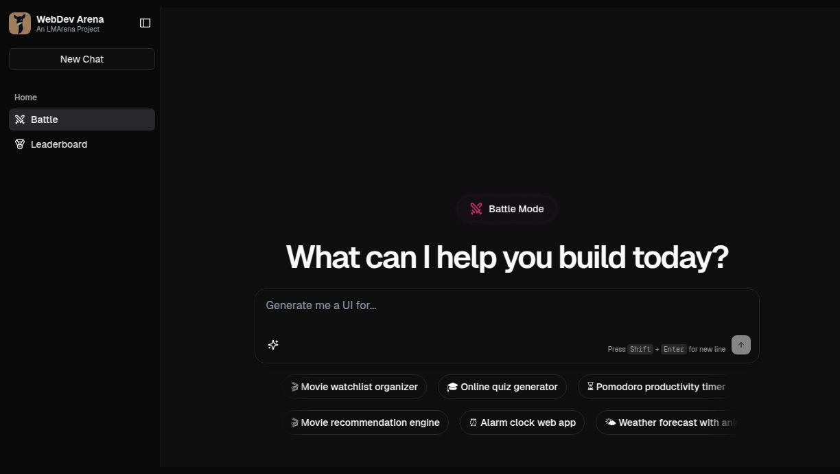 WebDev Arena är en kostnadsfri öppen plattform där två LLMs tävlar mot varandra i webbutveckling. Användaren skriver en prompt och ser två kodexempel i realtid, där användaren sedan röstar fram det bästa alternativet.